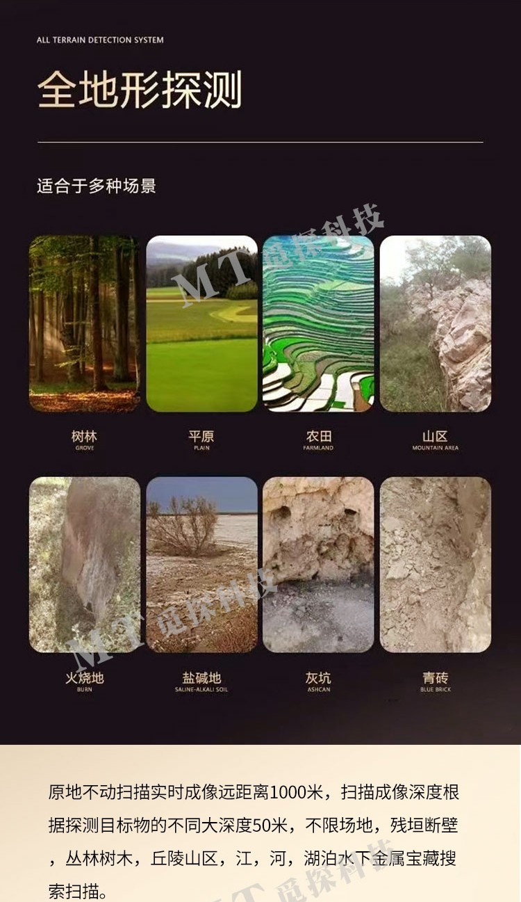原地不動(dòng)掃描實(shí)時(shí)成像距離1000米,掃描成像深度根據探測目標物的不同深度50米,不限場(chǎng)地,殘垣斷壁,叢林樹(shù)木,丘陵山區,江,河,湖泊水下金屬寶藏搜索掃描。